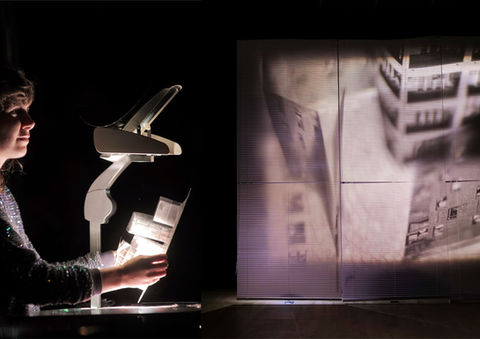 Le public est invité à voyager dans une fresque lumineuse, un vitrail fabriqué en direct, une bande dessinée mouvante. Les images en mouvement s’entrelacent aux musiques spatialisées, se déployant dans l’épaisseur de l’espace et du temps. Le dispositif – grand mécanisme légèrement aléatoire – est créé comme un ensemble de fenêtres ouvertes qui offrent de multiples points de vue au spectateur, l’invitant à balader son regard et se laisser immerger dans les récits sonores, les sons imagés, et les textures amplifiées.